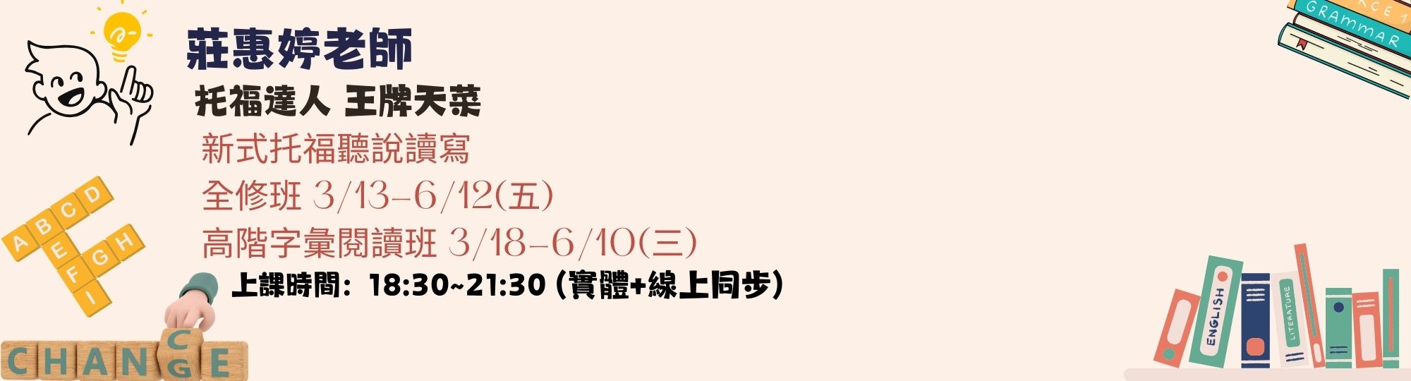 | 新式托福聽說讀寫全修班 (實體+線上同步) | 招生中 | 03.13~06.12 | 每週五 18:30~21:30 | 36 | $7,500 | 報名 | |