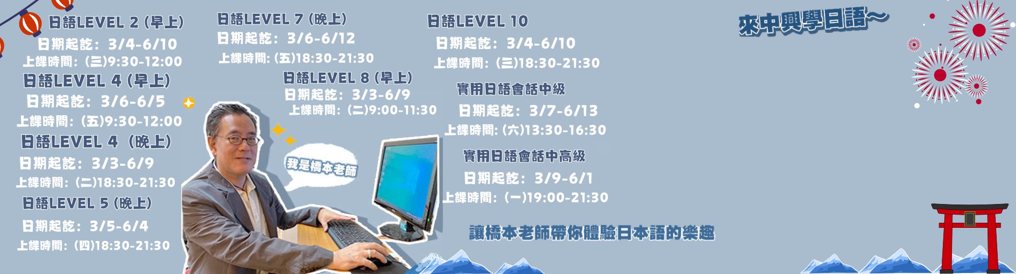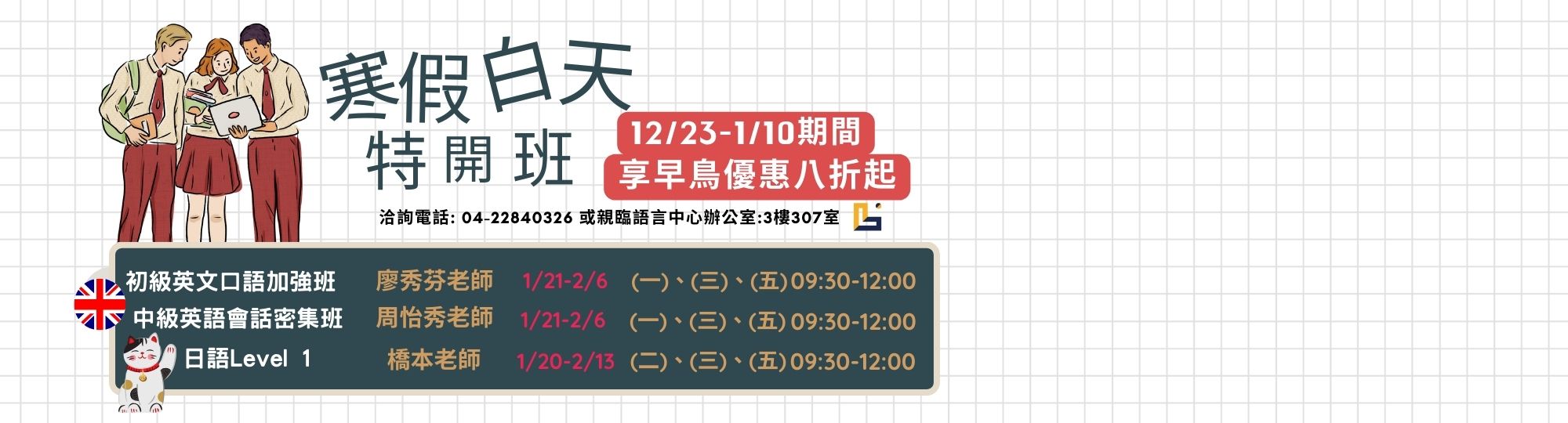 | 寒假日語 Level 1 | 招生中 | 01.20~02.13 | 每週二 , 三 , 五 09:30~12:00 | 30 | $6,000 | 報名 | |
