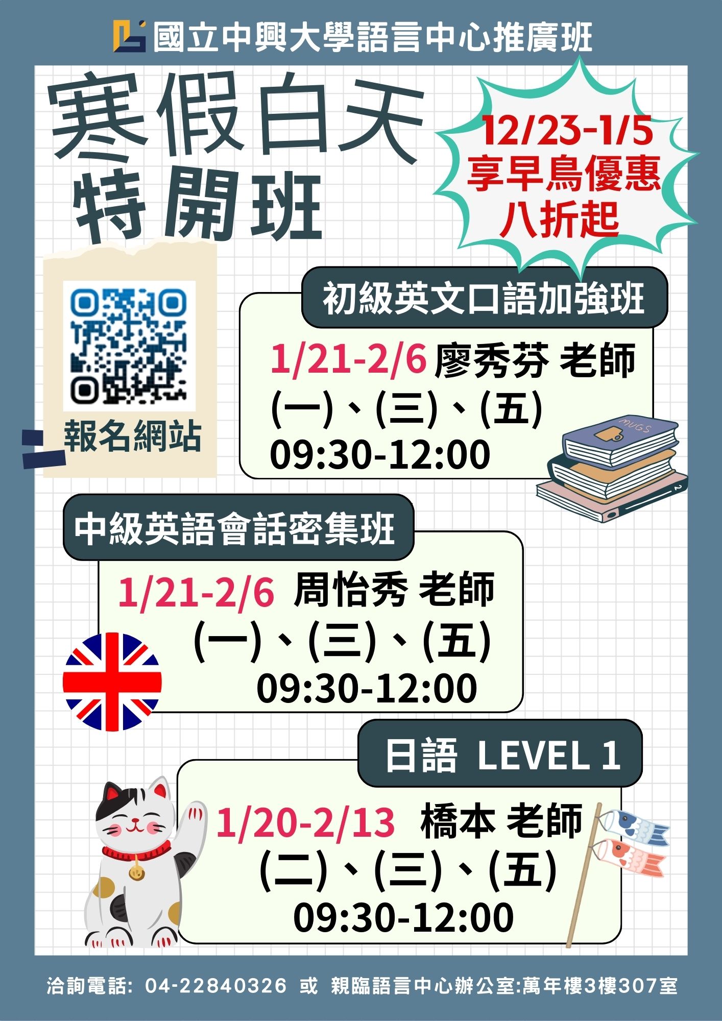加入【中興大學語言中心推廣班】FB粉絲專頁/LINE好友,課程資訊不錯過!